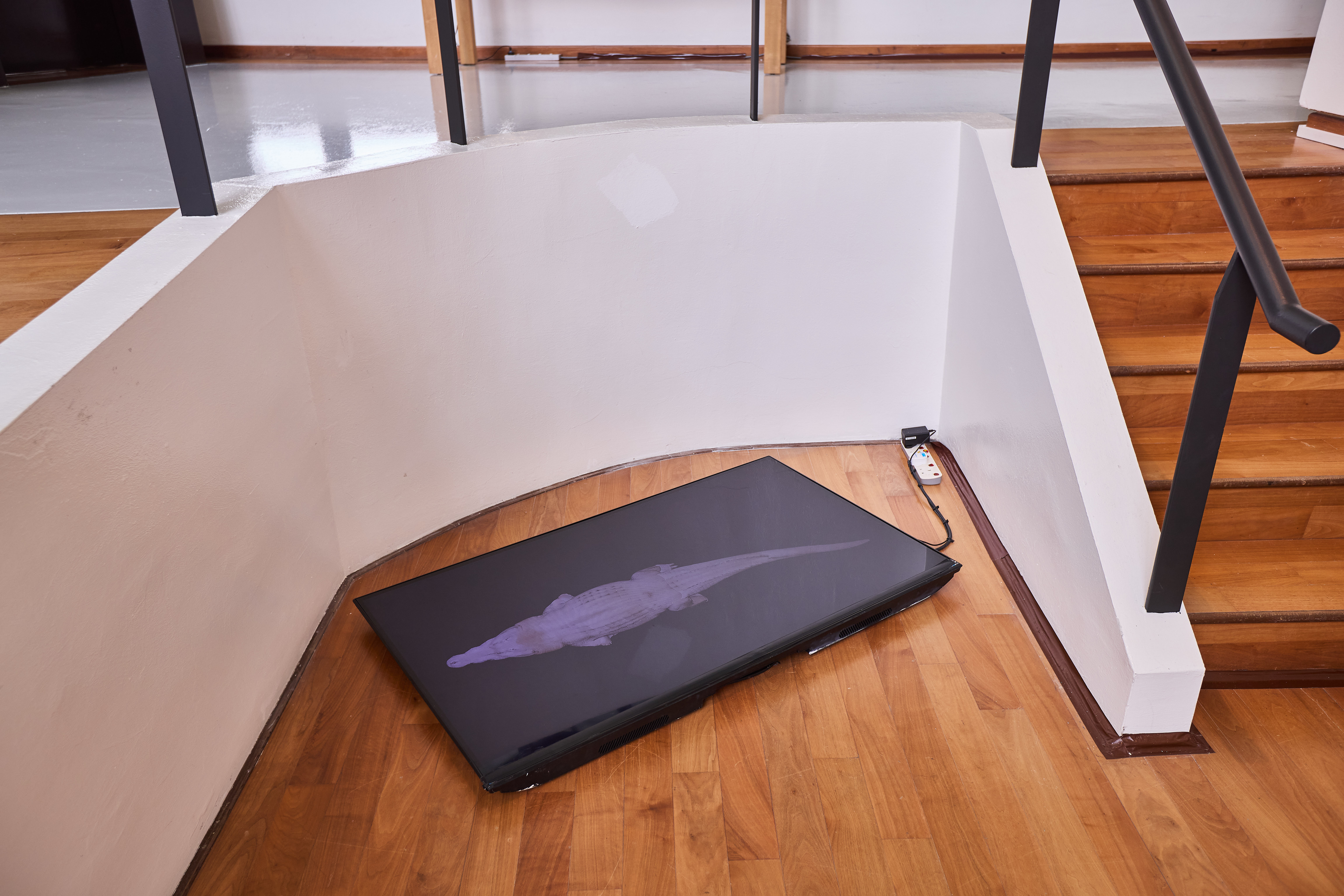 In particular, the piece was inspired by the myth of a vengeful Iban warrior who reincarnated into Bujang Senang, a man-eating saltwater crocodile. Workshopping this transformation, the artist warps his own body parts in analogy to the body parts of the crocodile, echoing a human propensity to project and compare ourselves to the other.