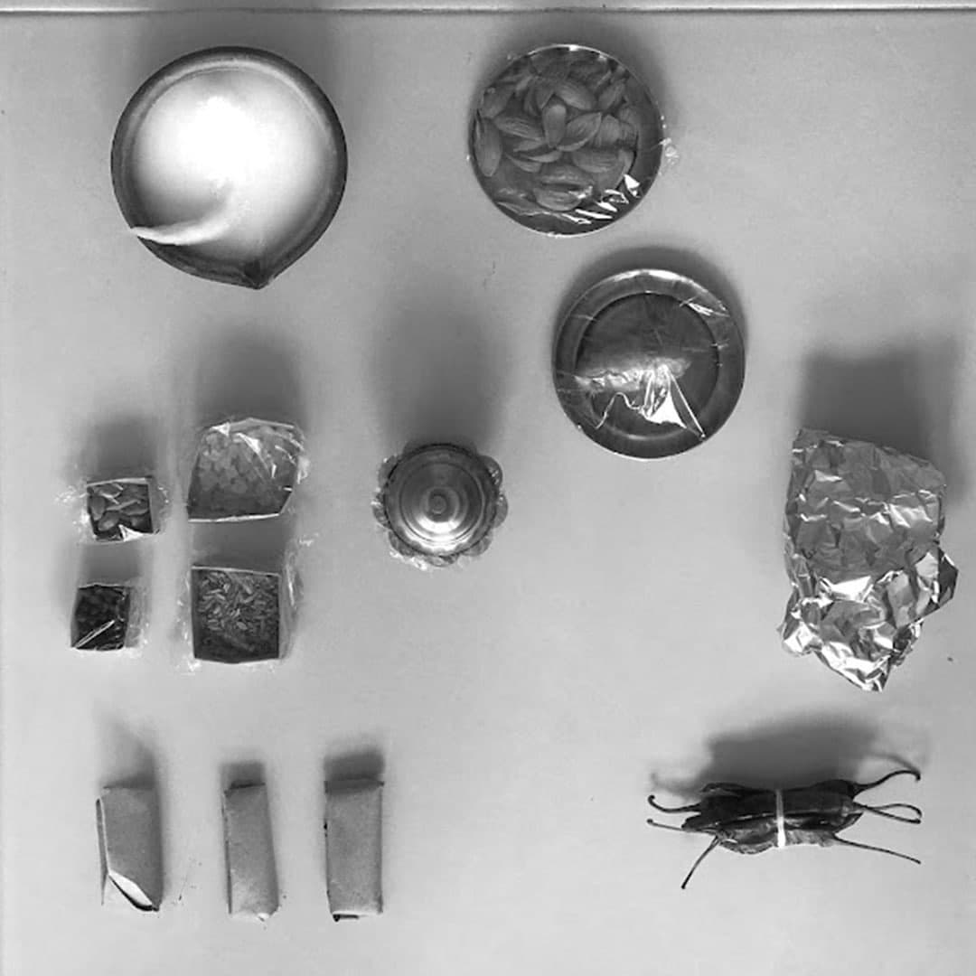 Materials - Care-Package; Milk, Curd, Ghee, Paneer, Almonds, Tea Leaves, Honey, Jaggery, Mishri, Batasha, Dried Chillies, Saffron, Black Pepper, Green Cardamom, Clove, Fennel Seeds, Chat Masala, Turmeric Powder, Cinnamon Powder, Boondi, Oil Lamp, Mauli Thread, Bamboo Plate, Cellophane, Hawker Paper