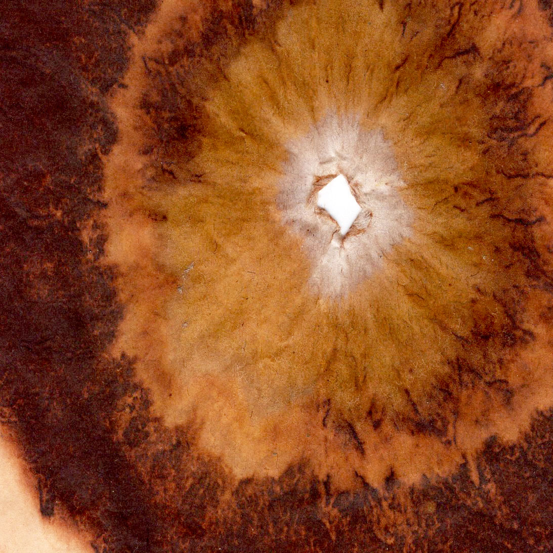 Soil on Rice PaperGround Up is an intuitive experiment exploring the land we stand on - a photographic amalgamation of soil and light. Diluted soil is fed into paper prepared with specific chemicals; after some time and exposure, an analytical image of the land we stand on emerges. This process is often used in permaculture to examine soil quality and to seek out impurities.